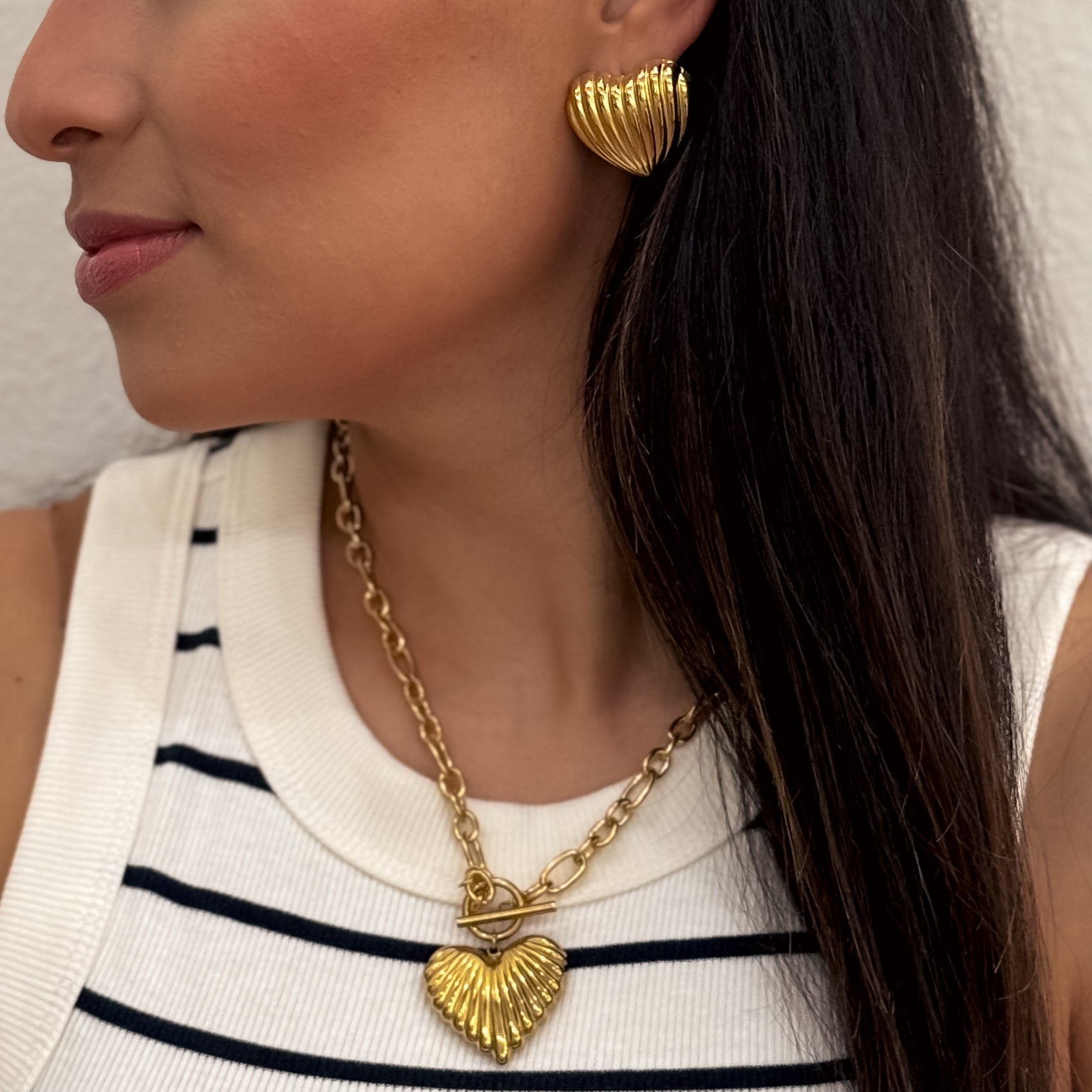 Fall in love with The Aure Heart Necklace, a sculptural heart pendant on a chunky gold chain made to shine with confidence. Crafted with a bold toggle clasp and radiant ridged detail, Aure Heart is where modern romance meets golden edge. Whether it’s a gift for someone you love—or a statement of self-love—this piece makes its presence known.