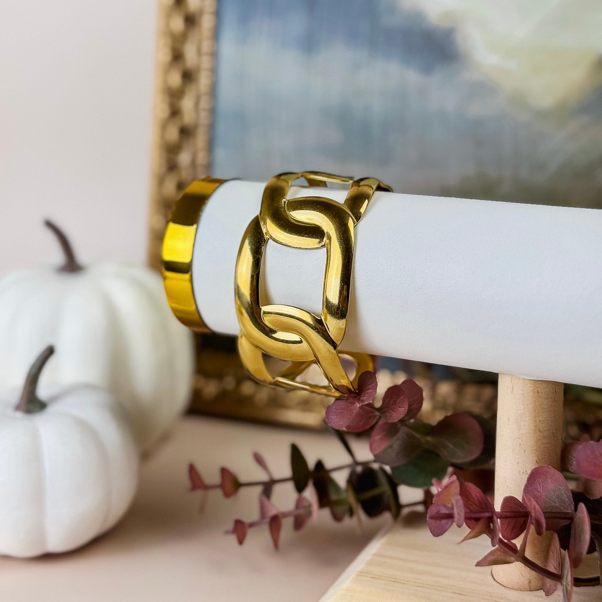 Bold and modern, the Gold Link Cuff Bracelet features an open-link design with a polished gold finish. Its statement style makes it the perfect piece to wear solo or stacked with slimmer bangles for a layered look.