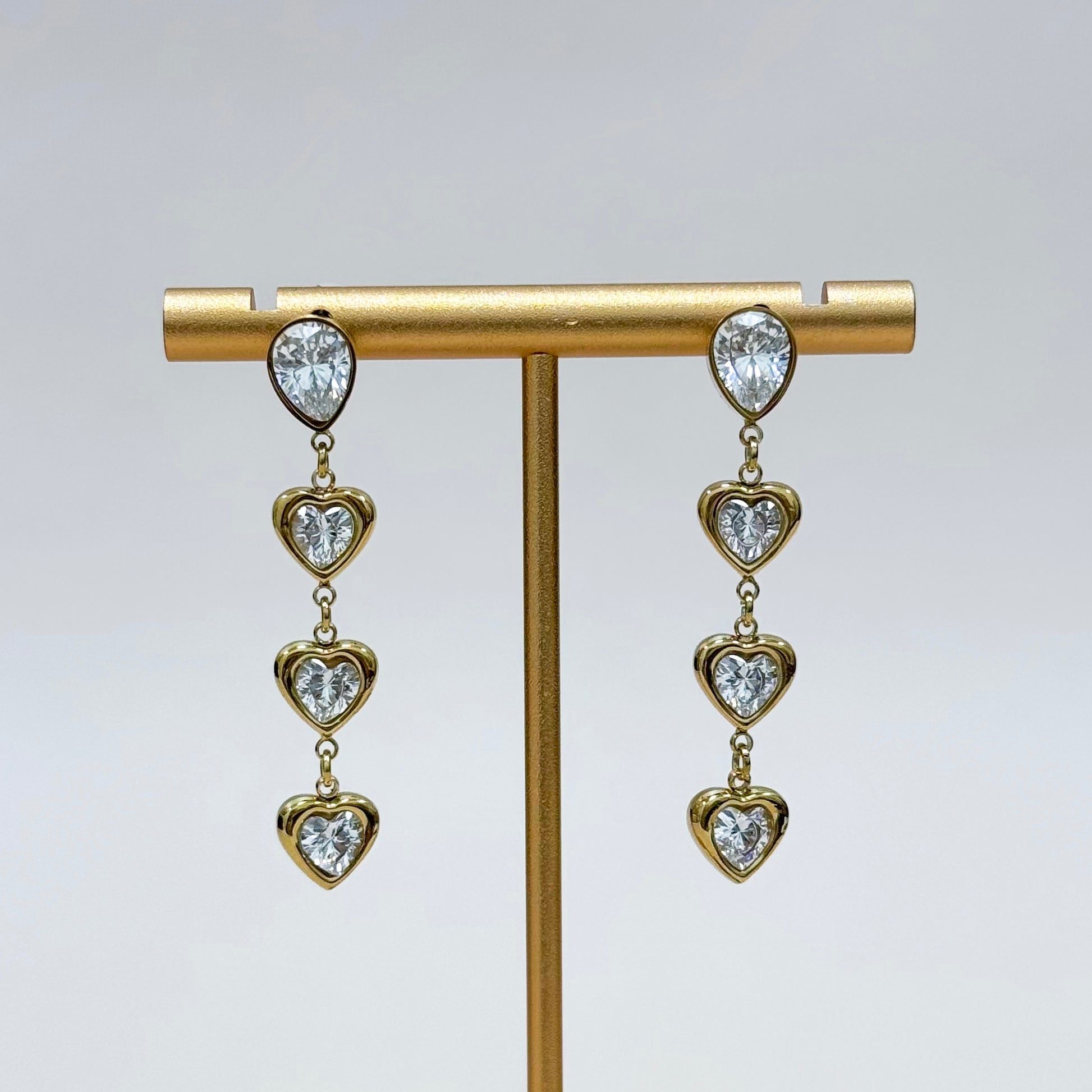 Delicate yet dazzling, the Heavenly Hearts Drop Earrings feature a cascading line of crystal-filled hearts that shimmer with every movement. Each golden frame reflects light beautifully, creating a soft glow that feels romantic, graceful, and timeless.