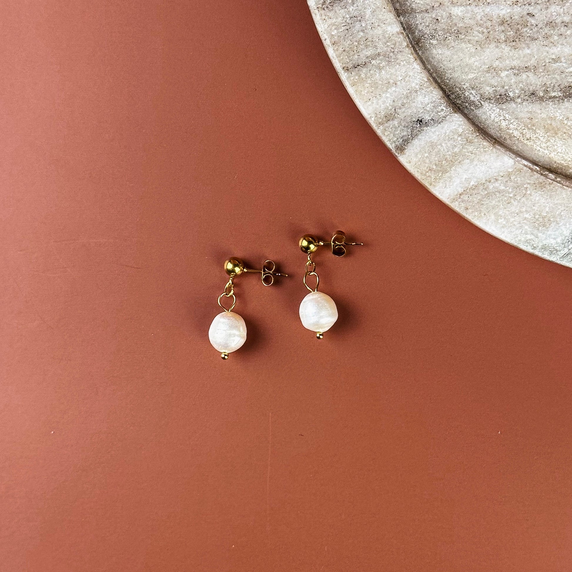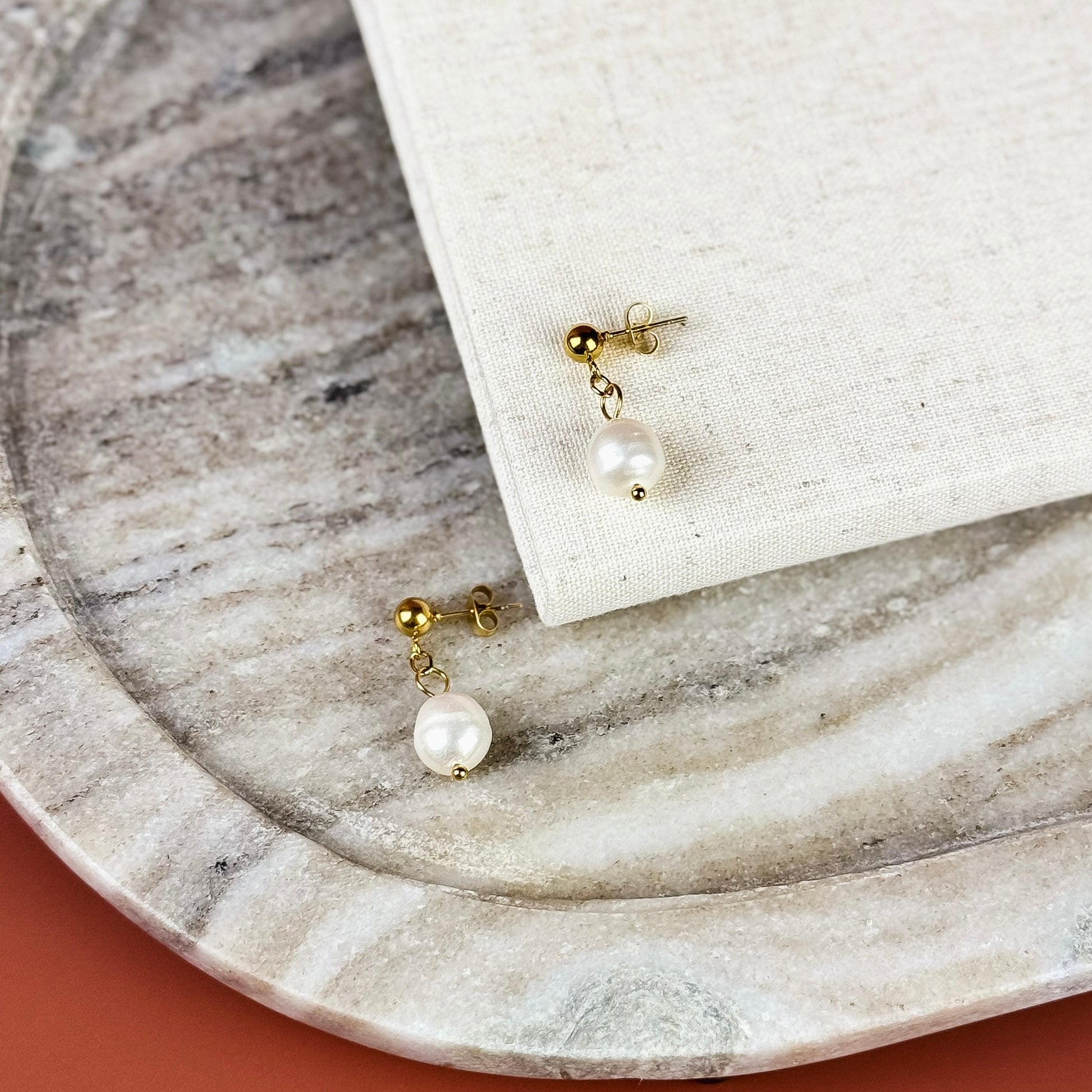 Meet The Isla Pearl Studs—a delicate balance of soft shimmer and timeless style. Featuring genuine freshwater pearls suspended from polished gold studs, these lightweight earrings add the perfect feminine touch to your everyday look. Whether worn solo or paired with your favorite gold layers, Isla is a subtle statement with endless versatility.