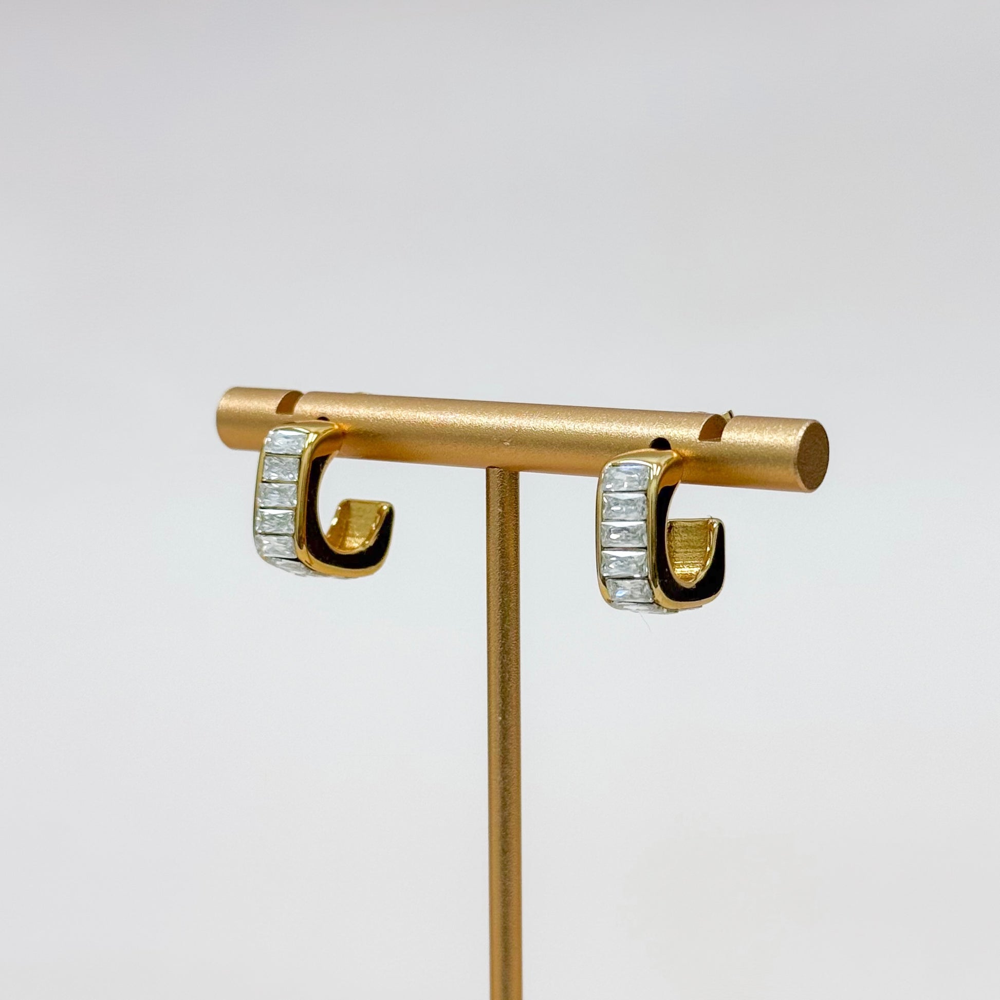 A modern classic with a refined sparkle. The Luxe Baguette Cuff Hoops feature a bold gold-tone silhouette inlaid with sleek baguette-cut crystals for a clean, radiant shine. Designed in a softly curved cuff shape, they give the look of a statement hoop while staying lightweight and comfortable for all-day wear.