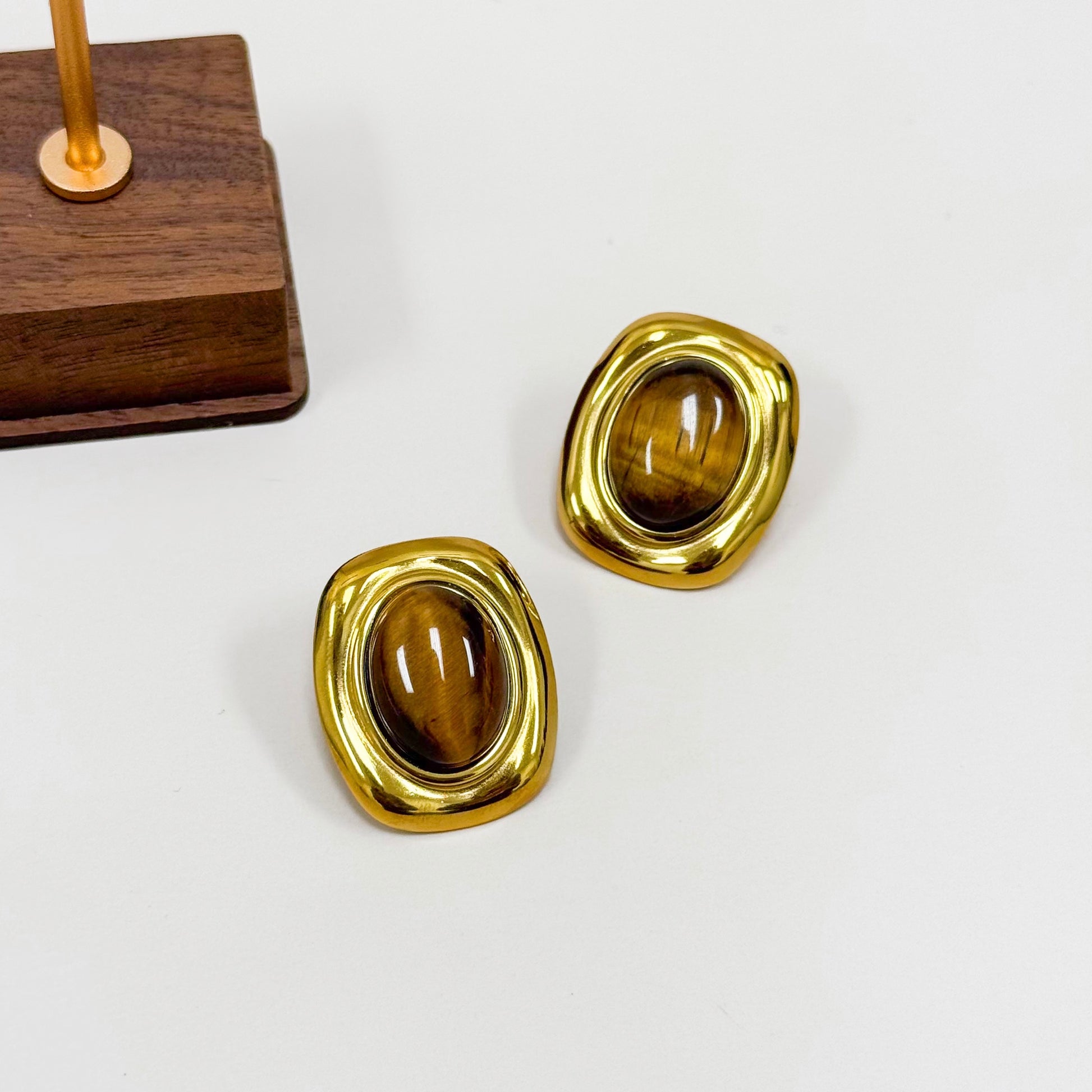 Sleek and sculptural, the Solene Stone Studs feature a polished gold oval frame surrounding a warm, earth-toned stone. Designed to make a statement without feeling heavy, these studs bring a refined, modern edge to any look.