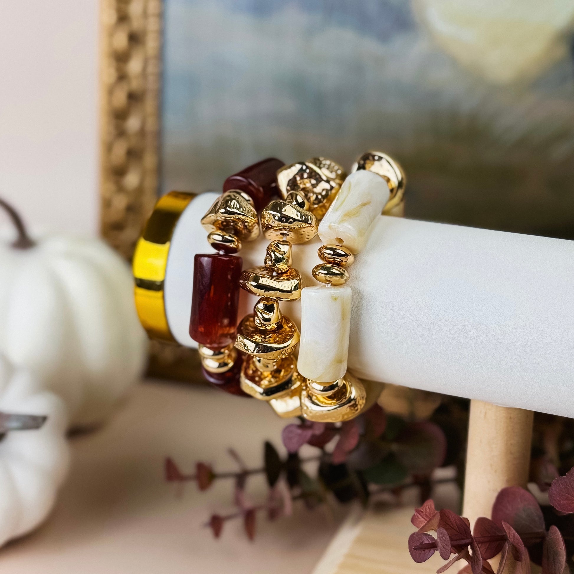 A statement stack that speaks volumes. The Ember Stack features chunky gold beads paired with smooth oversized stones in your choice of Black, Burgundy, or White. Wear them all together or mix and match for a bold, effortless edge.
