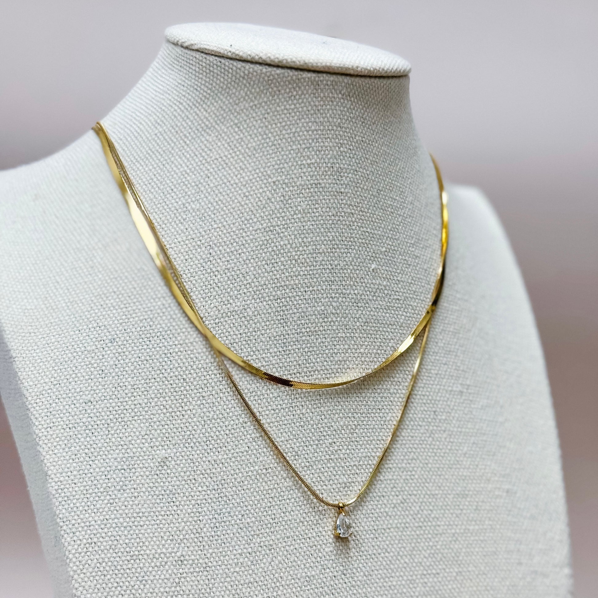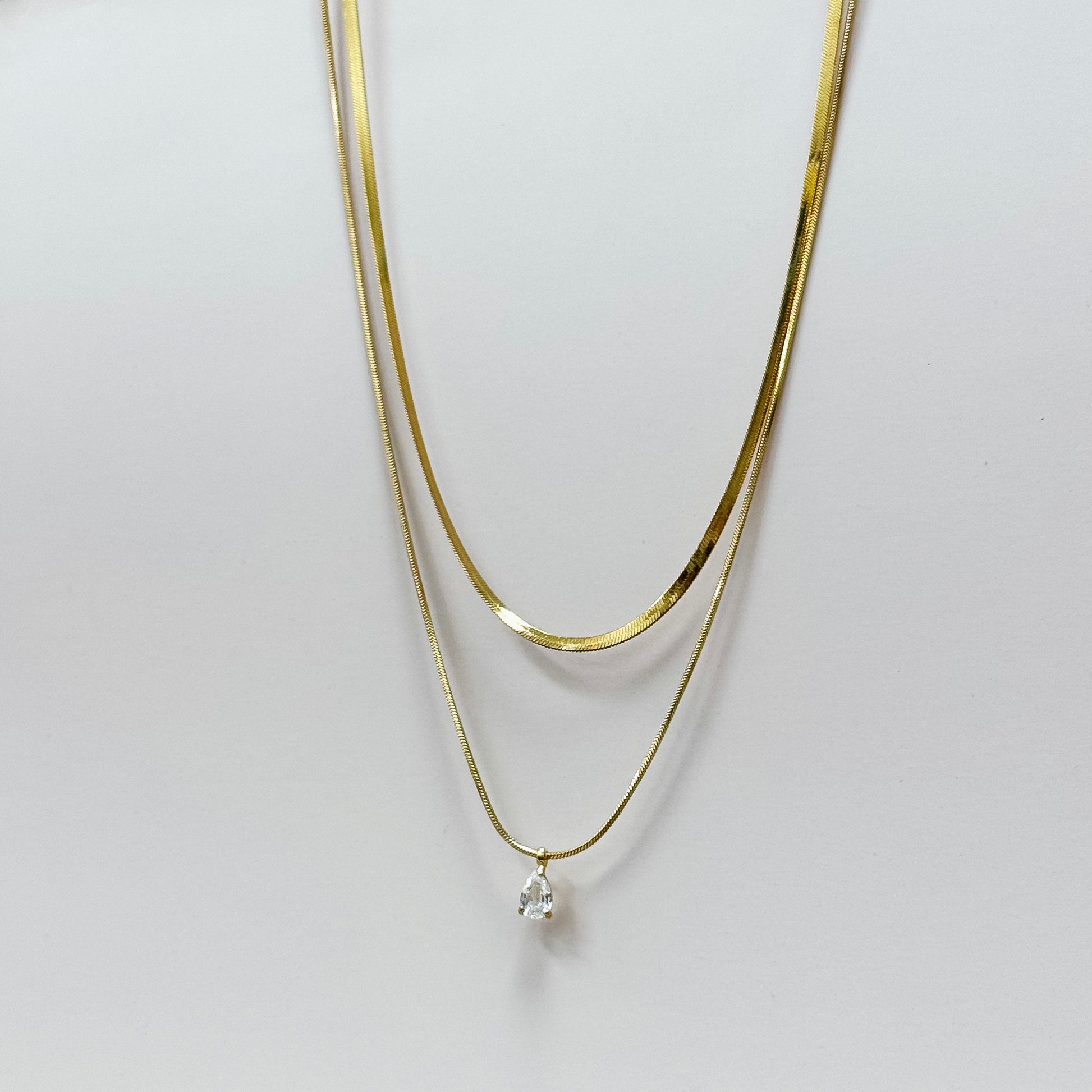 The Lumina Layered Drop Necklace features a refined double-layer design with a sleek herringbone chain paired with a delicate lower chain finished with a crystal drop pendant. Minimal yet eye-catching, this piece is designed to elevate your everyday look while remaining timeless and effortless.