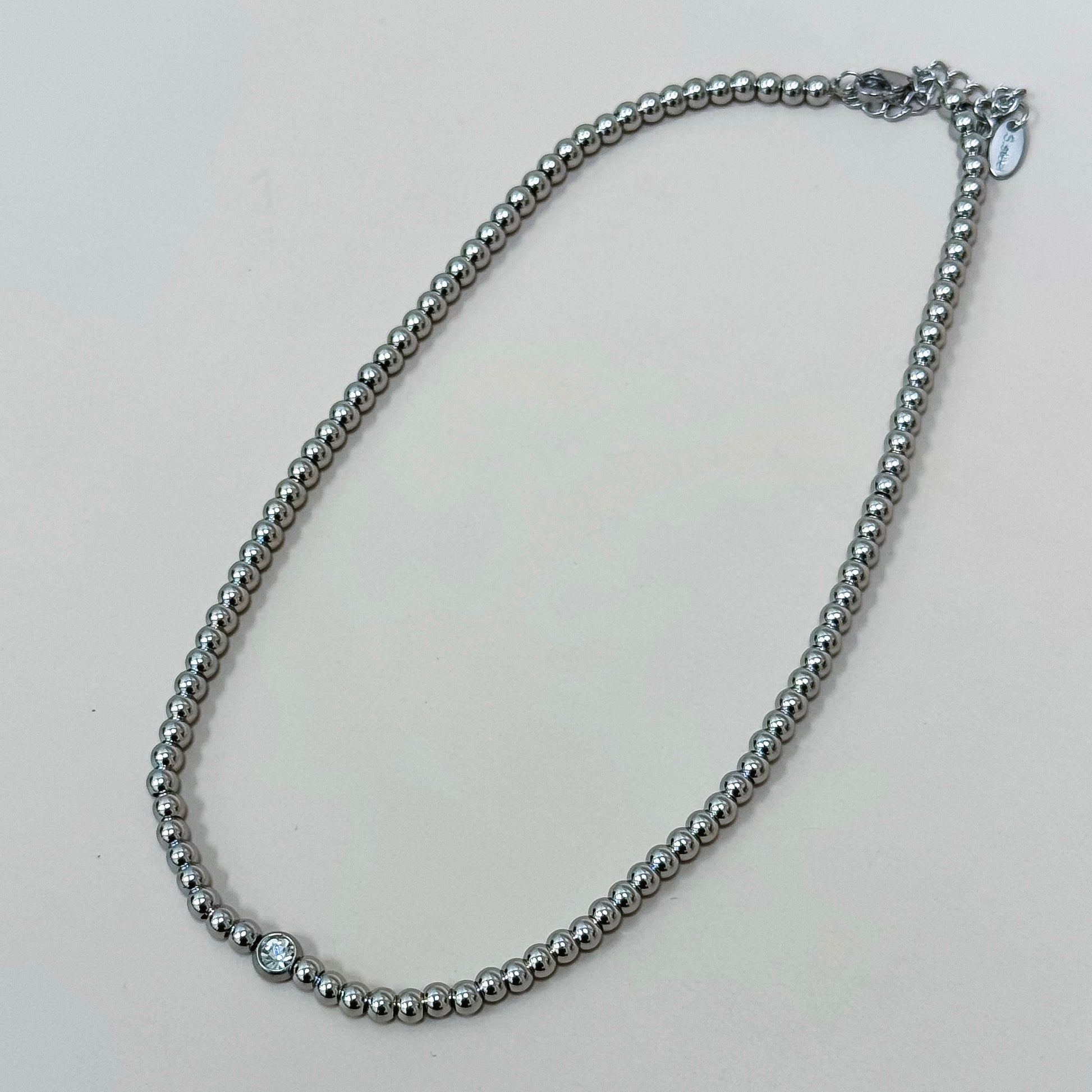 The Radiant Bead Necklace features a strand of polished metal beads finished with a single crystal accent at the center. Understated yet elevated, this piece is perfect for everyday wear or effortless layering.